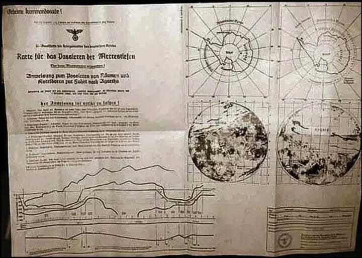 Alguns também falam sobre a Operação Highjump e as viagens do Almirante Byrd, onde dirigíveis extremamente avançados foram vistos voando e explorando novos territórios. Não muito tempo atrás, descobrimos um mapa do terceiro Reich no qual há várias passagens secretas retratadas que foram usadas por U-Boats alemães para acessar misteriosas regiões subterrâneas, bem como um mapa completo de ambos os hemisférios e do misterioso reino de Agartha.
